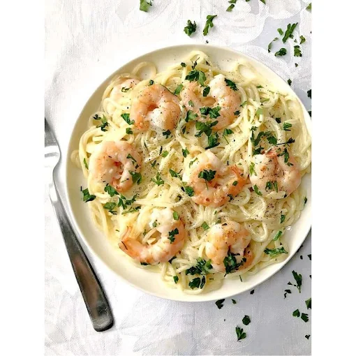 a creamy, rich pasta dish made with prawns, cooked in a smooth Alfredo sauce made from butter, cream, garlic, and Parmesan cheese, offering a savory, indulgent flavor.